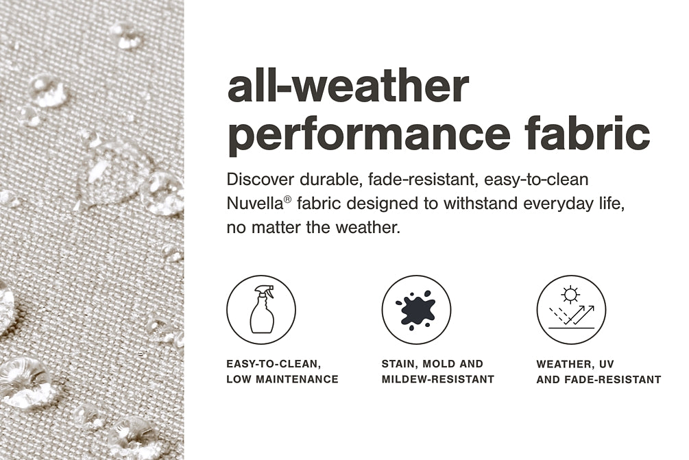 | Details | Includes 7 modular pieces: 5 outdoor lounge chairs and 2 outdoor end tables, Chair frame and table made with aluminum, Solution-dyed high-performance fabric, Nuvella® is an outdoor fabric that can be cleaned and offers UV resistance, Stainless steel hardware, Designed to withstand the harsh elements of the outdoors, Cushioned seat, Back cushion included, Includes PVC protective weather cover, Clean fabric with mild soap and water, let air dry; for stubborn stains, use a solution of 1 cup bleach to 1 gallon water, Assembly required | |