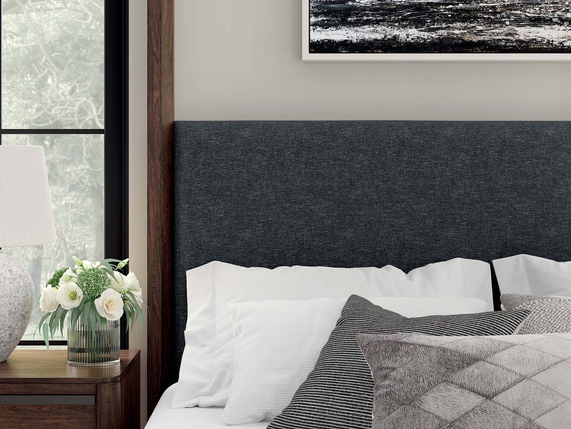 | Details | Includes canopy, upholstered headboard, footboard, rails, posts and slats, Made with hardwood solids, mango wood veneer and MDF substrates , Side rails feature laminated solid hardwood slat support rails (or LVL) with glued and screwed blocking for added strength, Complex, rich dark brown finish, Foam headboard cushion with polyester upholstery , Measure room, including ceiling height, to ensure bed clears fans and light fixtures, Foundation/box spring required, sold separately , Mattress available, sold separately , USB-A and USB-C charging ports, Power cord included; UL Listed, Assembly required | |
