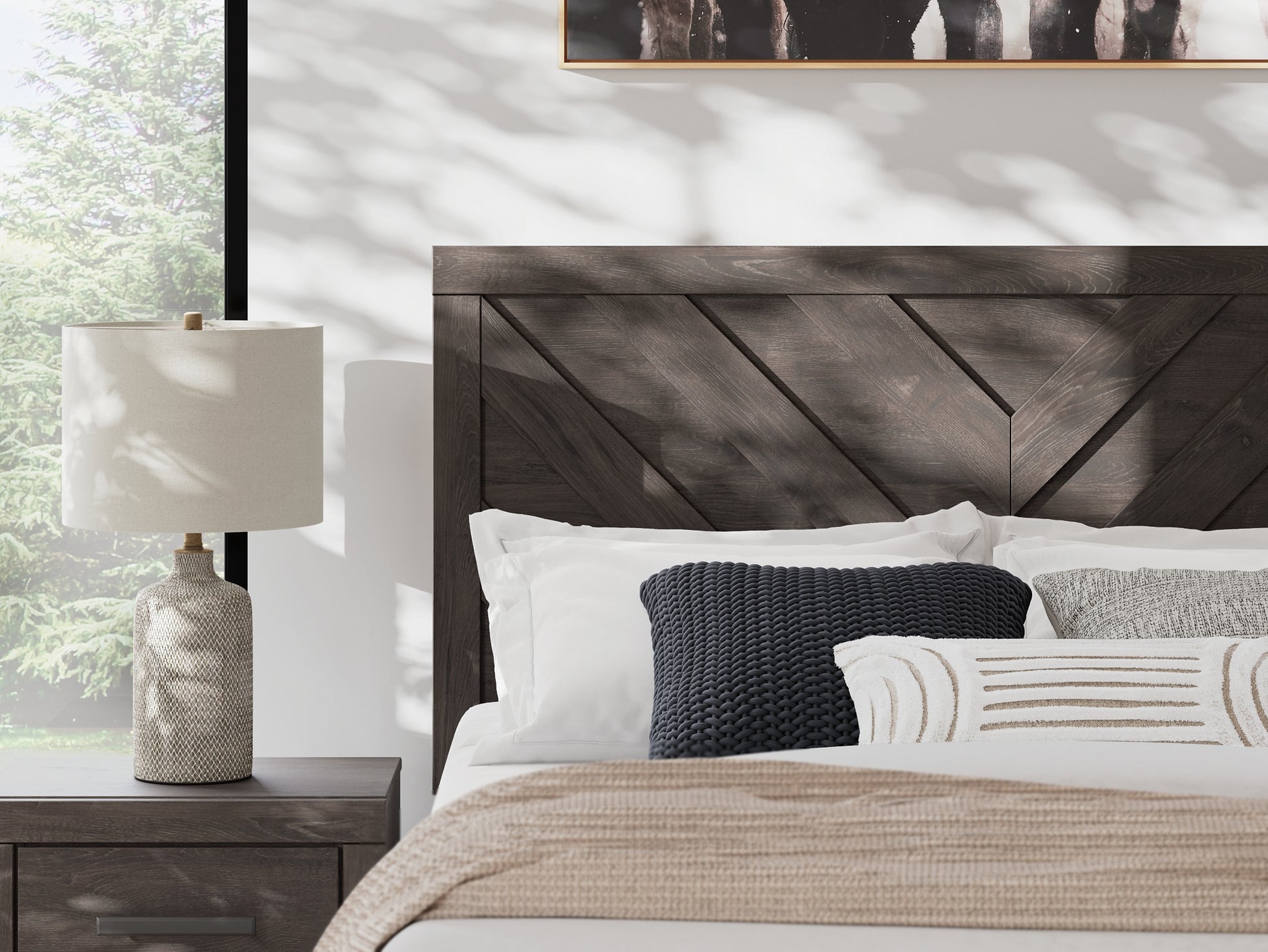Designed with everyday style in mind, this queen panel bed is a simply chic approach to modern living. A dark charcoal finish blends black and brown undertones, creating a versatile look that effortlessly pairs with your existing pieces. And for an extra dash of trend-right style, the headboard is dressed in a playful chevron pattern.
