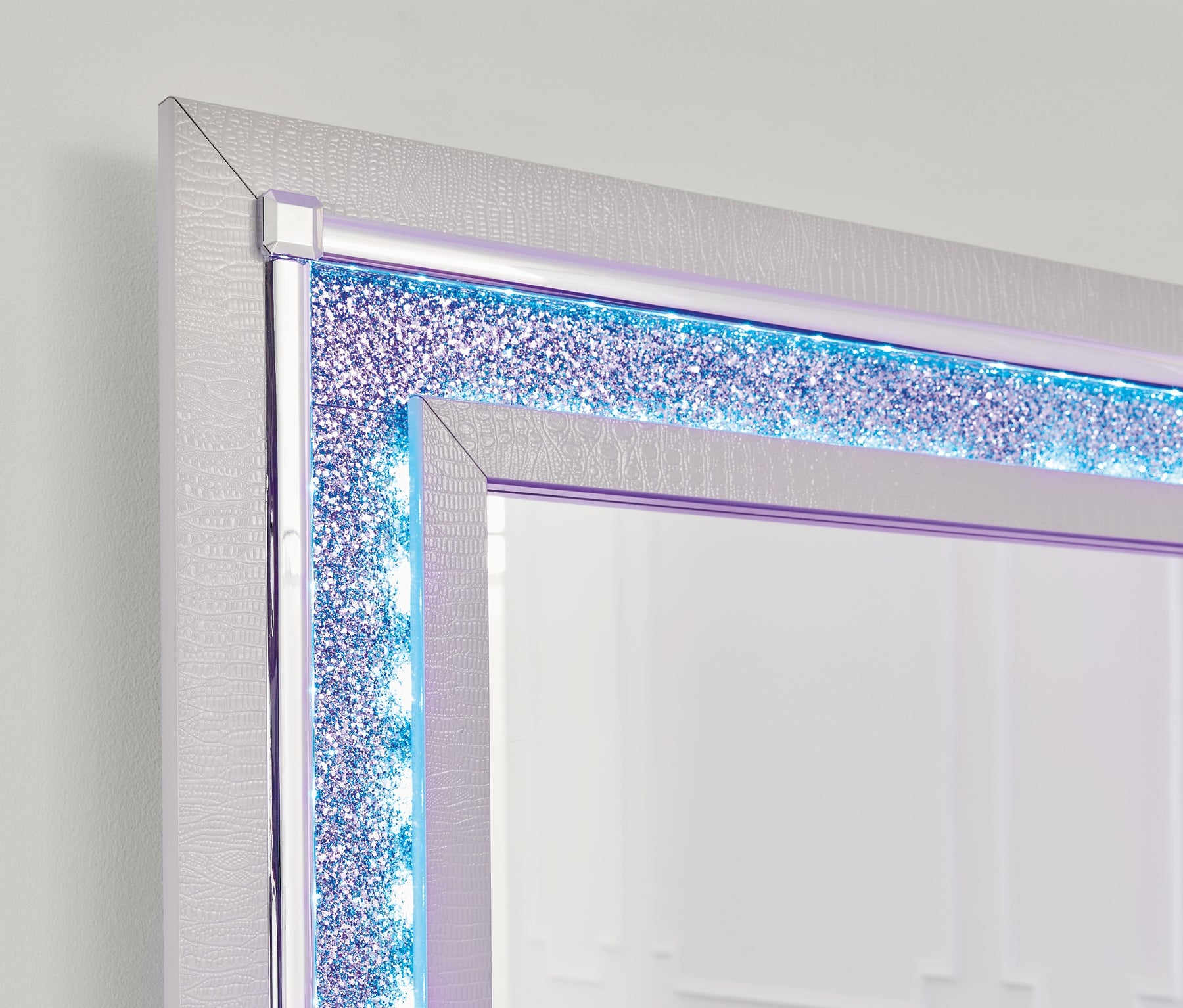 | Details | Includes dresser and mirror, Made with engineered wood (MDF/particleboard/plywood) and decorative laminate for the right balance of affordability and durability, Silvertone pearl finished faux gator, Decorative laminate replicates natural or man-made material surfaces with consistent color, pattern and texture, Handles with faux crystal accents, 6 smooth-gliding drawers , Drawer interiors are lined with a faux linen laminate for a clean, finished look, Faceted chrome-tone details, Mirror includes LED lighting with remote for color and brightness options, Mirror attaches to back of dresser; can also be mounted on wall horizontally or vertically , Safety is a top priority, clothing storage units are designed to meet the most current standard for stability, ASTM F 2057 (ASTM International), Drawers extend out to accommodate maximum access to drawer interior while maintaining safety, Minor assembly required | |
